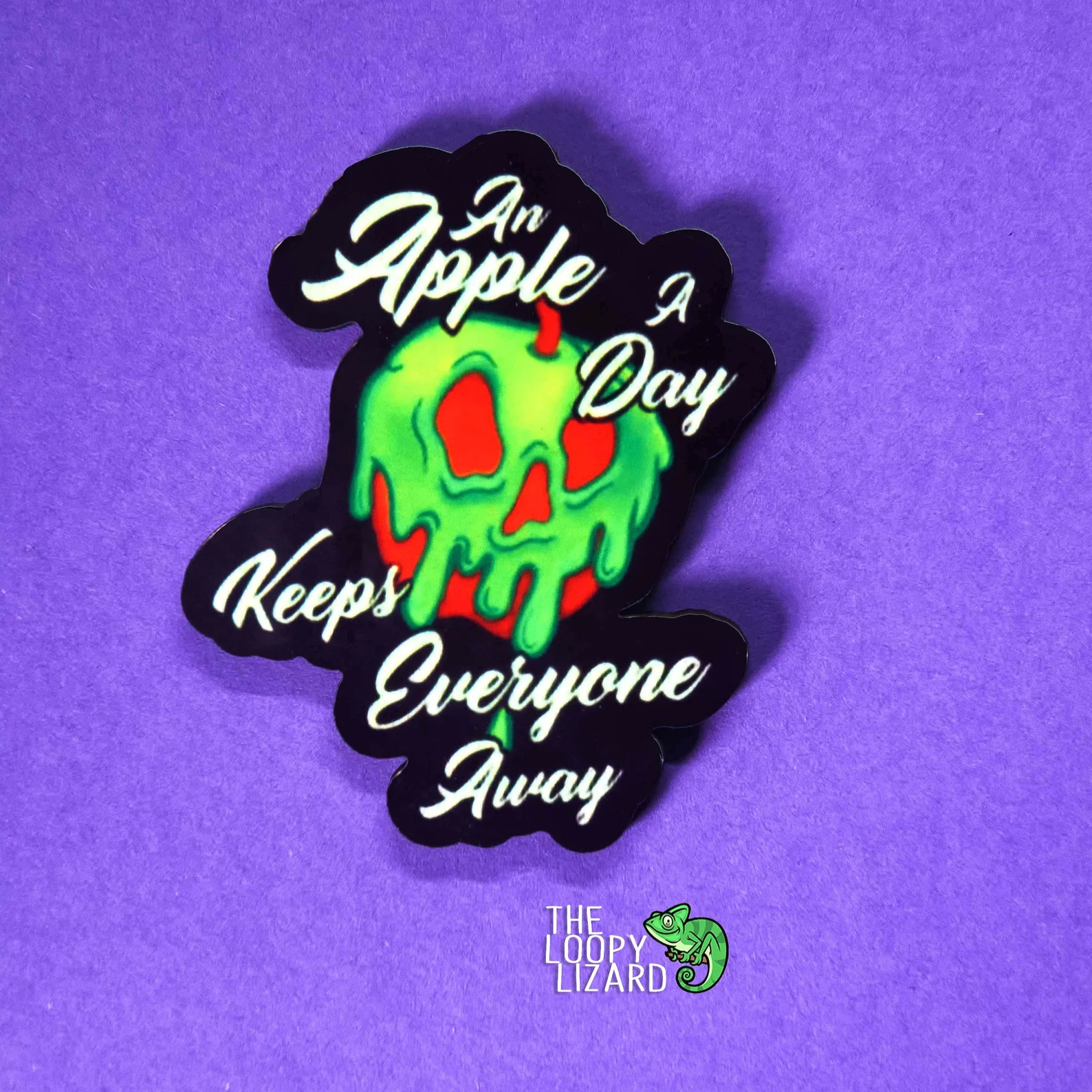 Looking to add a touch of wicked charm to your accessories? The Poisoned Apple Pin Badge or Magnet is here to full fill all your villainous fantasies! This devilishly delightful accessory features the iconic poisoned apple from Snow White, along with a cheeky little quote—“An apple a day, keeps everyone away.” It’s the perfect blend of mischief and magic, and it’ll make a bold statement wherever you go. Whether you’re an evil queen or just a fan of dark humour, this is a wickedly fun way to carry a piece of fairy tale treachery with you. Embrace the darkness—after all, who needs friends when you have a poisoned apple? 💀🍎✨