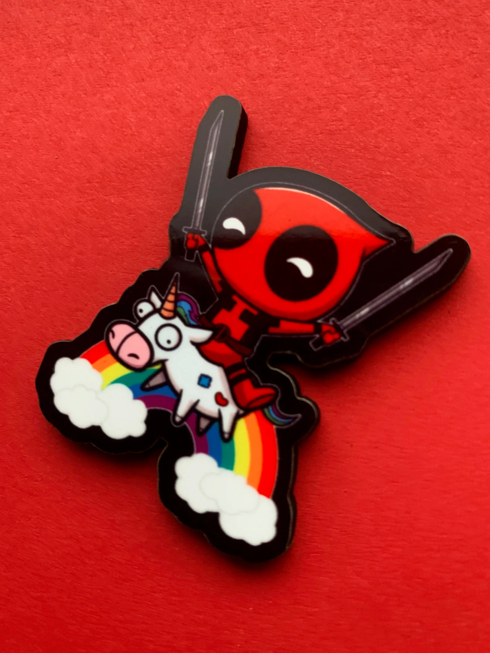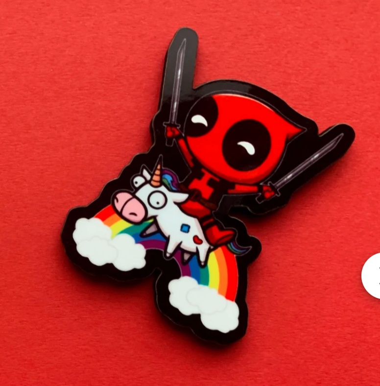 Hold on to your unicorns, because Baby Deadpool is here and he’s ready to make your accessory game epic! This adorable little antihero is riding high on a majestic unicorn, with katanas in hand and a smirk on his face that screams “I’m cute, but I’ll totally kick your butt!” Whether you’re a fan of Deadpool’s sass or just love the idea of a tiny ninja riding a mythical creature, this is guaranteed to bring a wild and fun twist to your day. Attach it to your fridge, backpack, or anything that could use a little bit of mischief and magic! Don’t wait—bring home the ultimate combo of cuteness and chaos today! 🦄⚔️💥