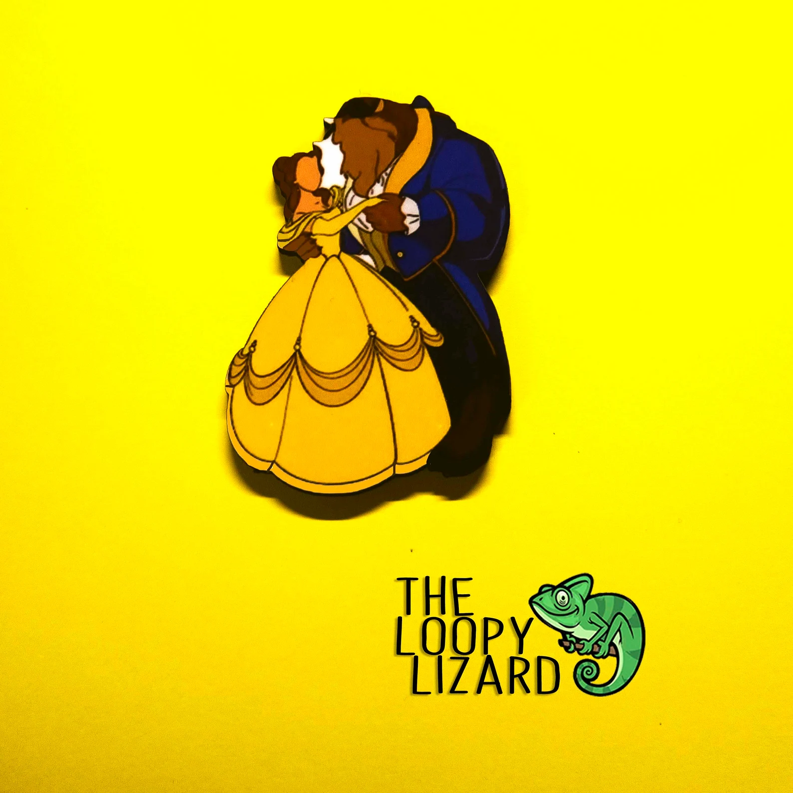 Step into a tale as old as time with our Belle and Beast Abstract Pin Badge or Magnet – the ultimate fairytale moment in miniature form! Capturing the magical waltz from the grand ballroom, Belle glides in her golden gown while the Beast, suited in royal blue, holds her close with surprising grace. This charming duo twirls in perfect harmony, reminding you that love can bloom in the most unexpected places. Attach it to your fridge or outfit and carry a sprinkle of enchantment wherever you go. Because when true love dances, the whole world watches! 💃🦁✨