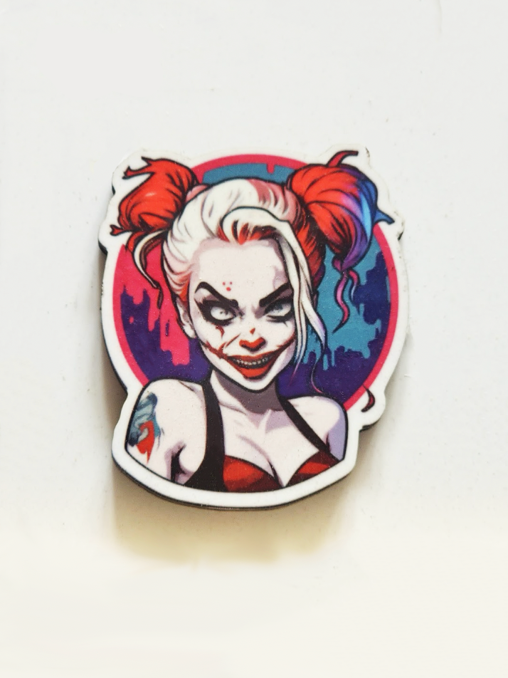 Say hello to mayhem in miniature! Our Harley Quinn Pin Badge/Magnet is the perfect little dose of chaos for your jacket, bag, or fridge. Featuring Harley in all her mischief-loving, heart-stealing glory — with wild eyes, bold colors, and that iconic cheeky grin — this accessory screams “puddin’” with every pop of pink, blue, and bat-swingin’ sass. Whether you’re a fan of her anti-hero charm or just living for the drama, this pin or magnet will have you saying, “What? I’m fun!” 💋🃏💣
