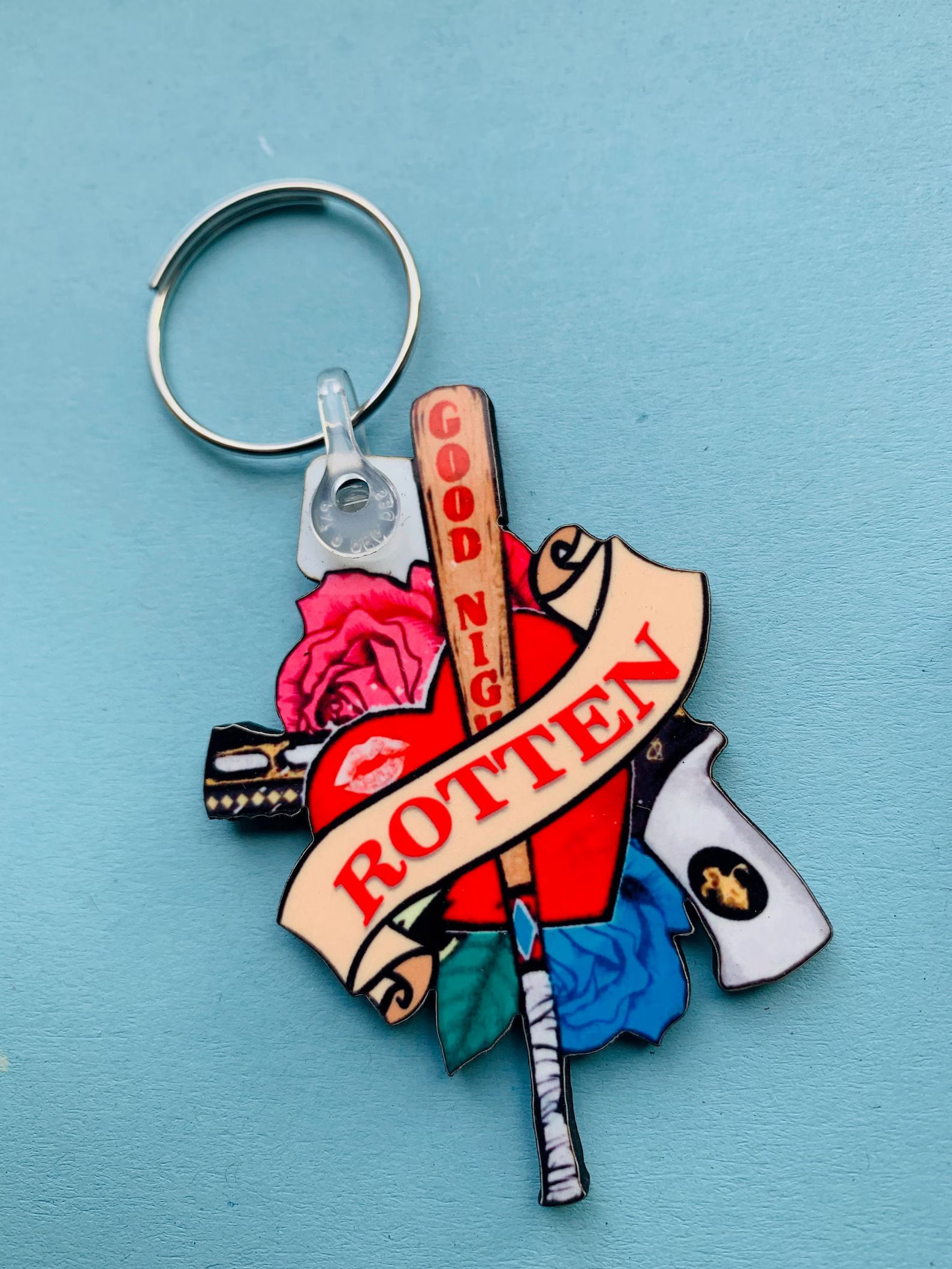 Get ready to add some wicked fun to your accessories with the Harley Quinn “ROTTEN” Keyring featuring the ultimate combo of Harley’s iconic white revolver and baseball bat. This keyring is the perfect mix of playful chaos and fierce femininity. The cute yet deadly design captures Harley’s wild spirit, blending her sweet side with her edgy, unpredictable personality. Whether you’re channeling your inner Harley or just love a touch of mischief in your life, this keyring adds a dash of fun and flair to your keys, bag, or jacket. Because sometimes a little love, a lot of attitude, and a whole lotta flowers make the perfect combination! 💋❤️💥