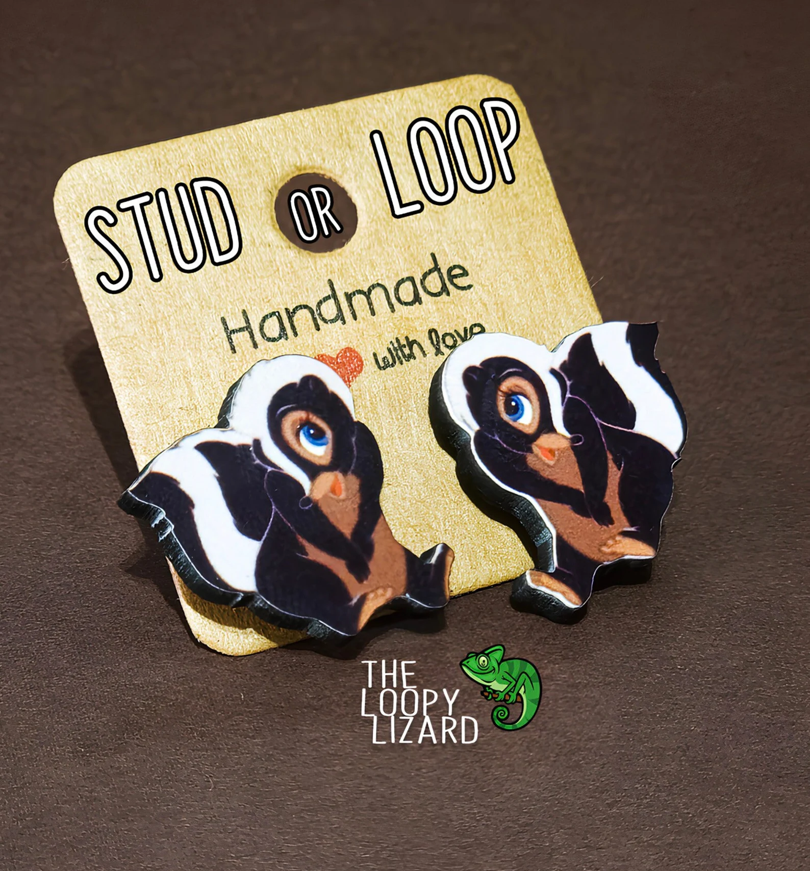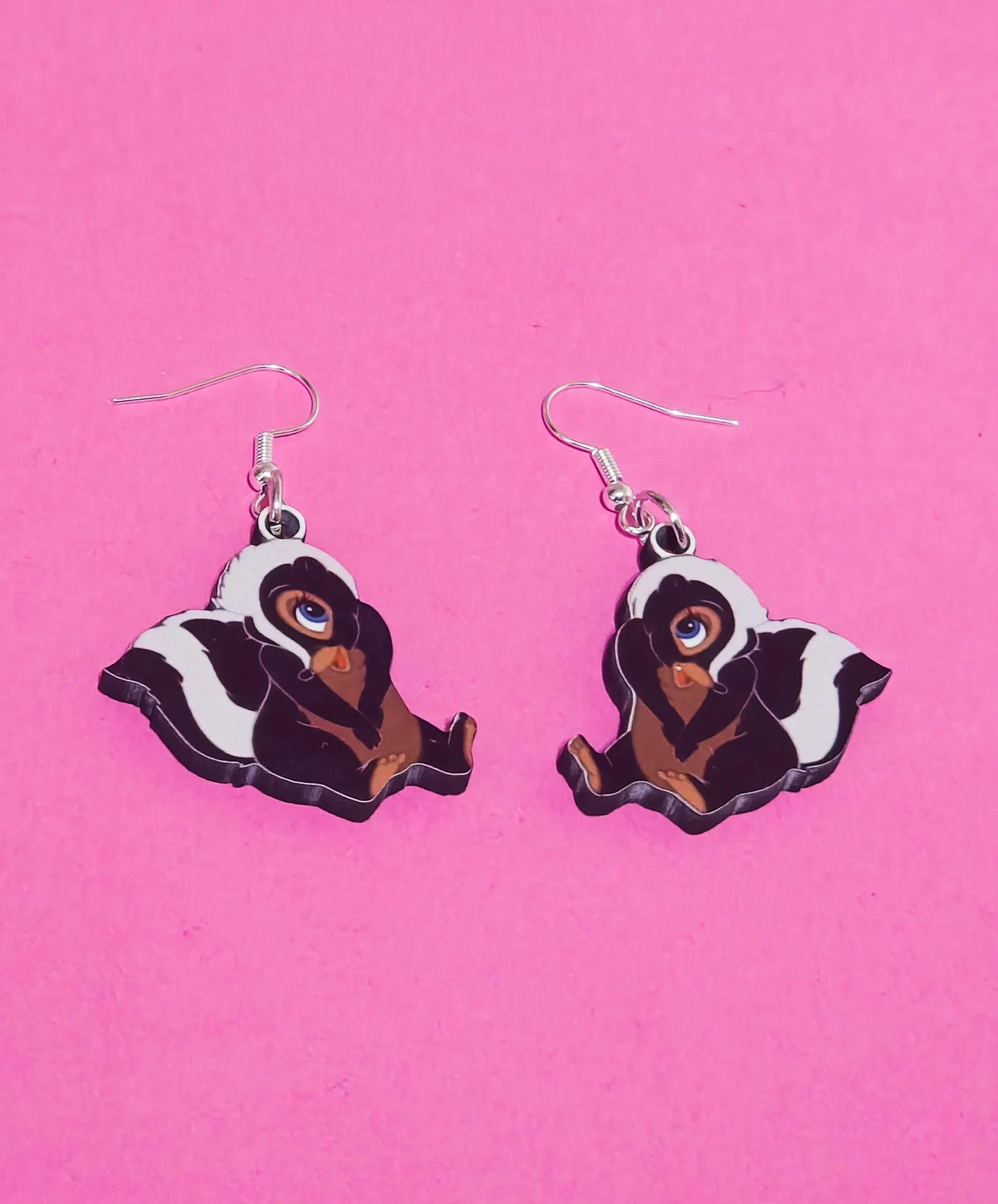 Introducing the cutest, most bashful pair of earrings you’ve ever seen –Shy Flower Earrings! These adorable Skunk earrings capture Flower's sweet, shy personality perfectly, whether you’re feeling a little timid or just love all things cute and cuddly, these earrings are here to brighten your day and show off your soft side, as he shyly peeks out from behind his tail. These earrings will have you feeling as sweet and gentle as Flower himself. Whether you’re a fan of the forest, love classic Disney characters, or just want to add some subtle charm to your outfit, these earrings are perfect for adding a little woodland whimsy to your day. Wear them and let Flower’s shyness bring a touch of magic wherever you go! 🦨🌸🖤